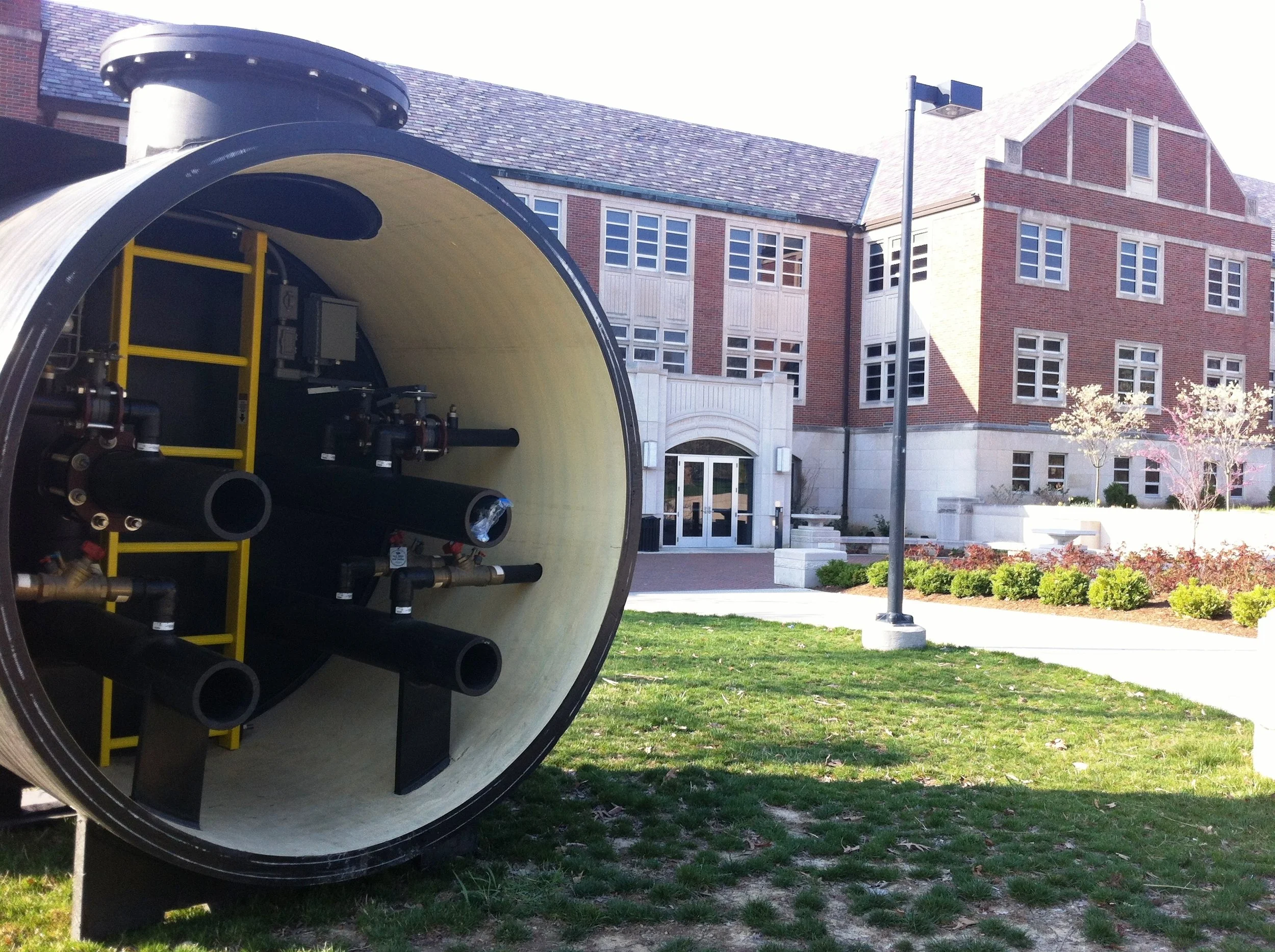 The district geothermal system includes 3,383 bores containing 1,000 miles of high-density polyethylene loop pipe; 10 miles of buried distribution piping; four 2,500-ton heat pump chillers; and, two new district energy stations. This system provides heating and cooling for 47 campus buildings comprising 5.6M SF.
